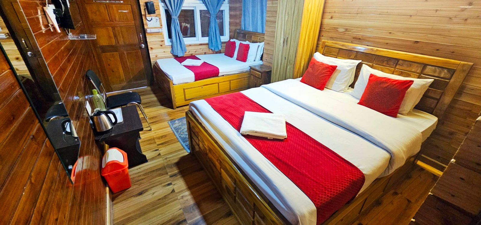Discover premium hotel rooms near Mall Road Darjeeling, offering luxury rooms with mountain views and spacious family suites. Our wooden interiors, modern amenities, and scenic surroundings make us one of the best hotel rooms for families near Raj Bhavan and Kanchenjunga view point.